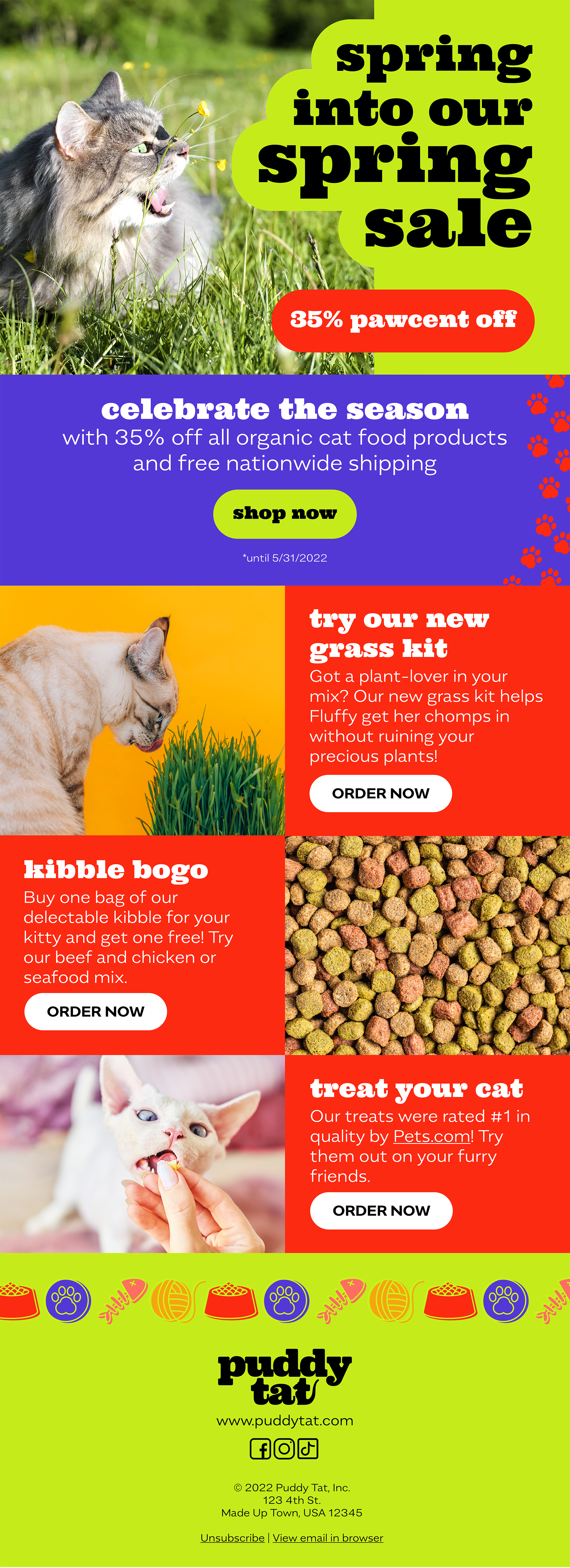 Cats are bold, mischievous, snarky, and energetic, and this visual brand reflects each of those characteristics. The email and social assets lean into internet cat culture and humor as a powerful tool to connect with cat owners online.